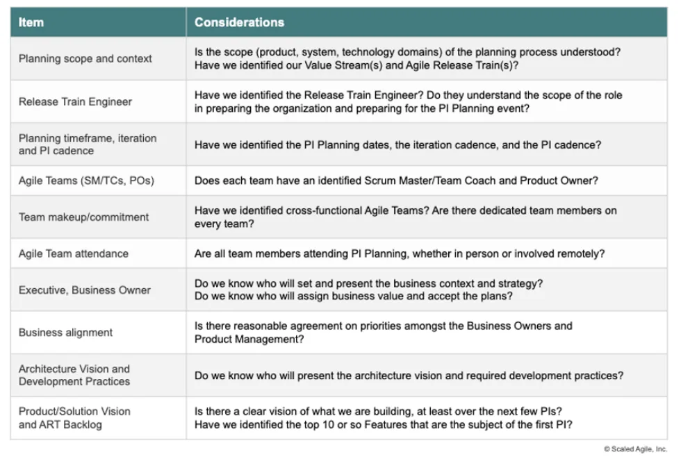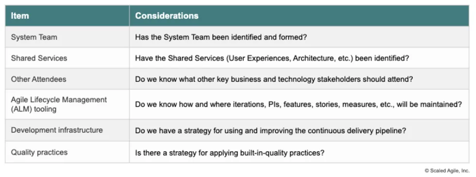 This ensures you focus on what will be planned and how it connects to a bigger vision, that all people involved—especially RTEs, SMs, and Product Owners—know their responsibilities during the event, and that you have planned the event itself—rooms, catering, tools, and more.
